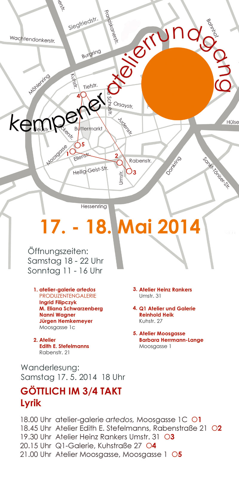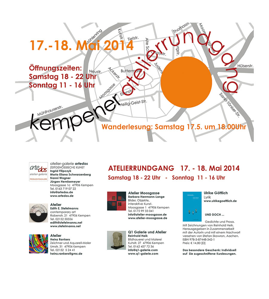 Die Kurzlesungen sind zu finden ... 18.00 H : atelier-galerie artedos | O1 18.45 H : Edith E. Stefelmanns | O2 19.30 H : Atelier Heinz Rankers | O3 20.15 H : Q1-Galerie | O4 21.00 H : Atelier Moosgasse | O5 | Wanderlesung 2014 | jpg, 90kb | Atelierrundgang 2014 | jpg, 140kb | ||||||||||||||||||